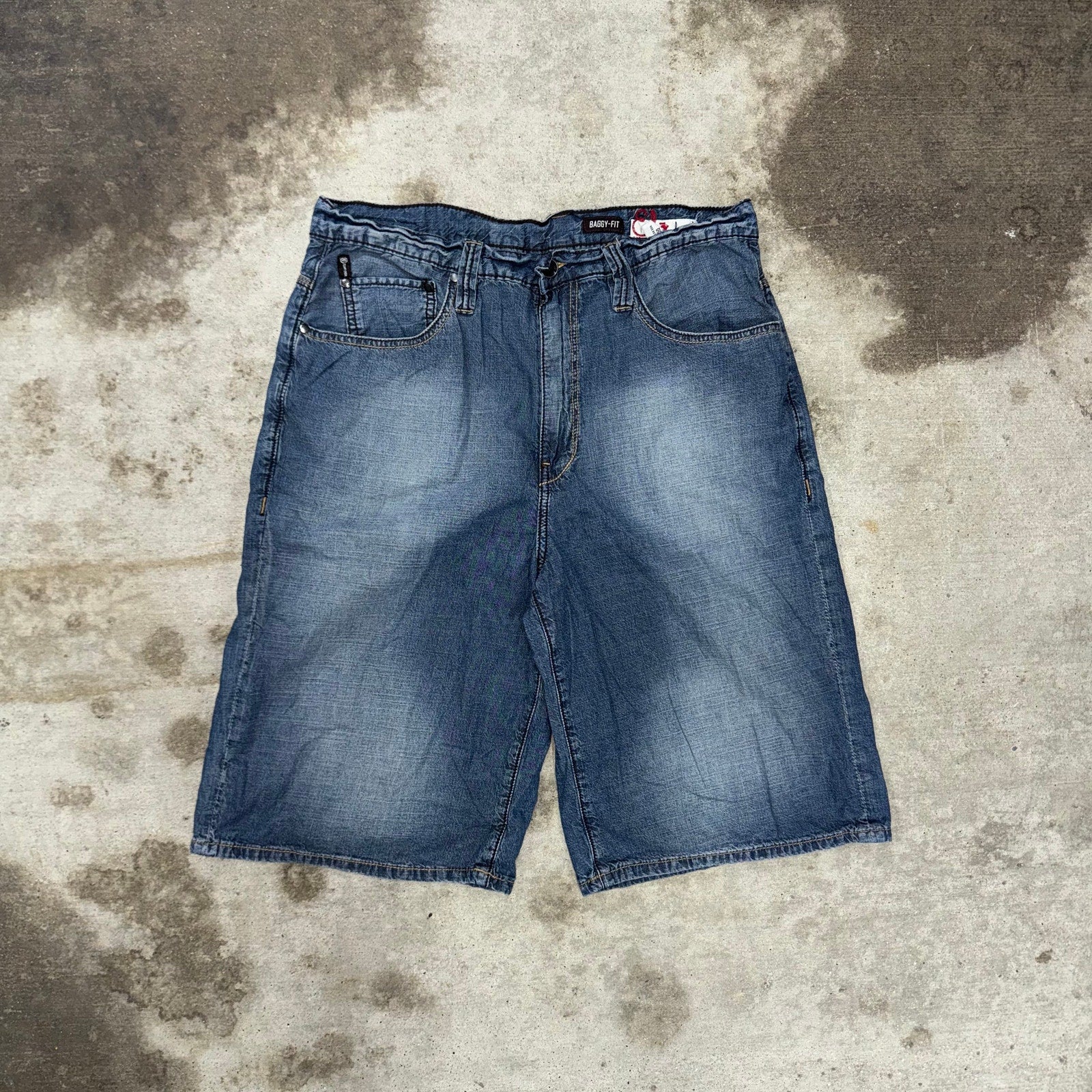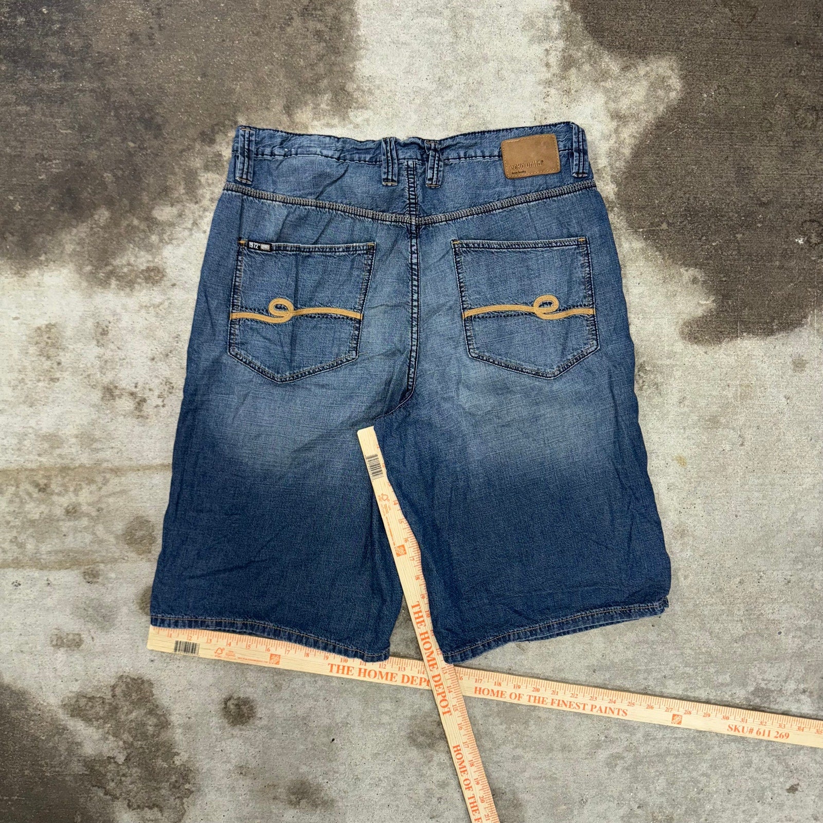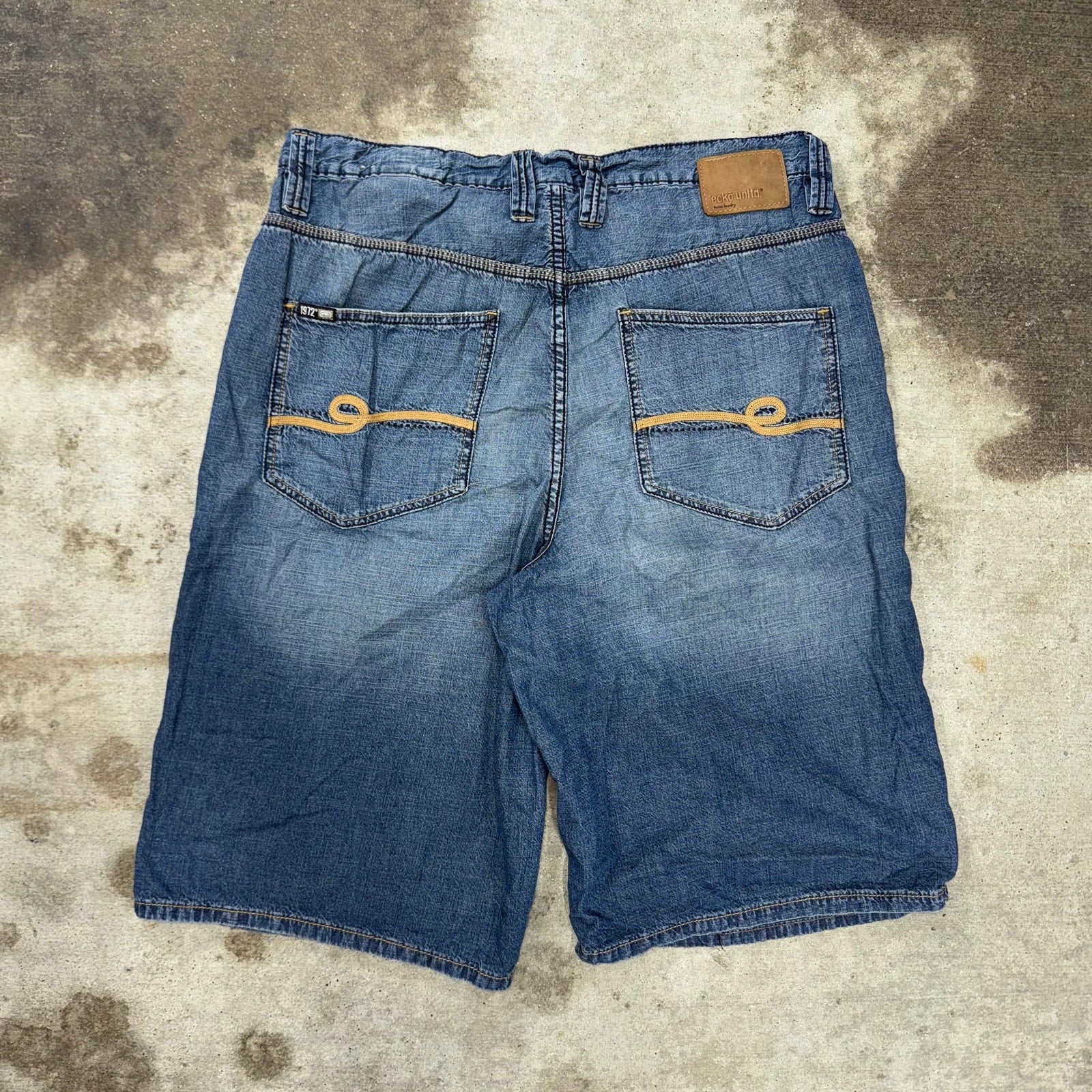 Vintage / Y2K ECKO UNLTD baggy, wide leg, hip-hop style grunge, Mal Goth embroidered back pocket E logo thin lightweight denim shorts, Gene JORTS Unlimited essential