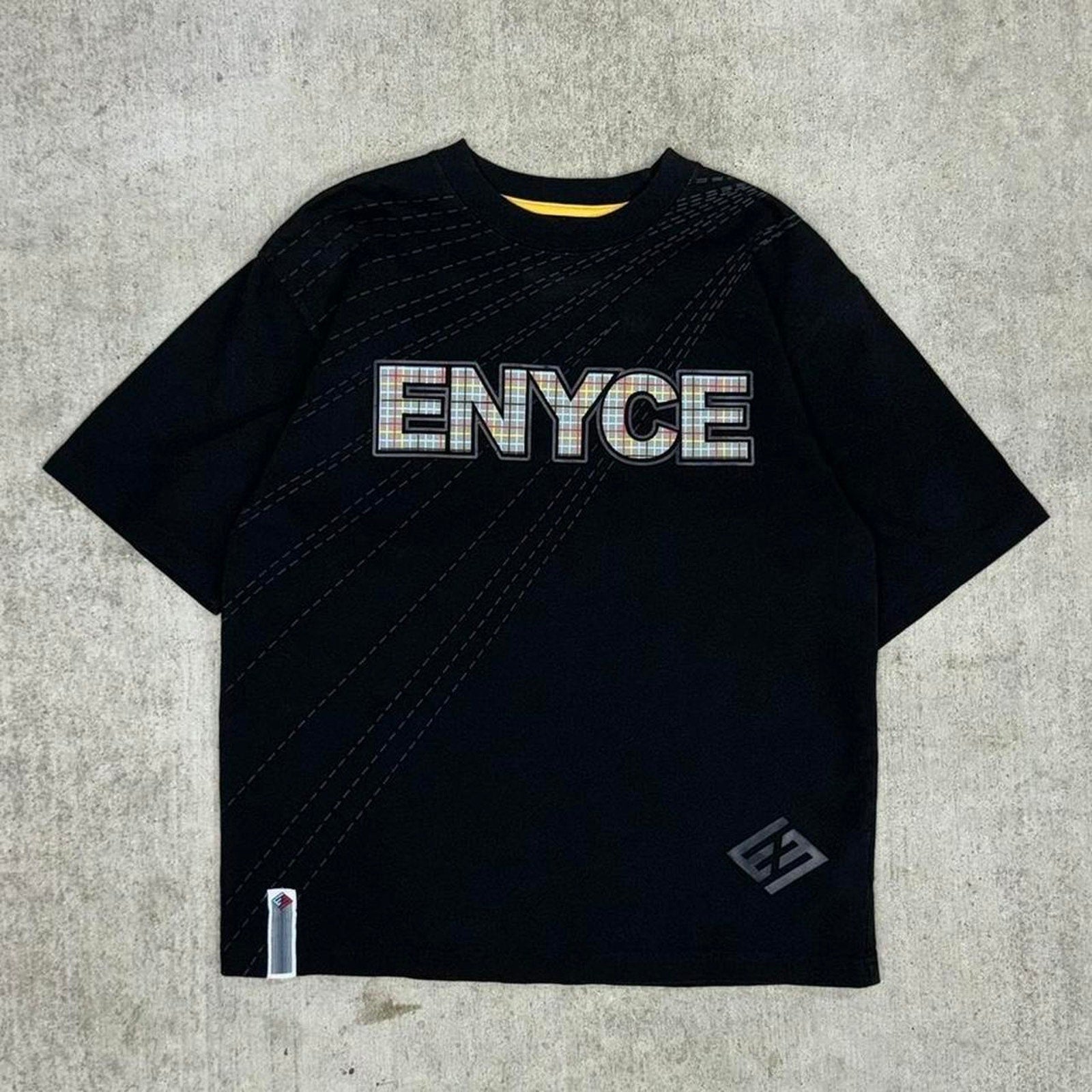 Vintage / Y2K ENYCE plaid logo spell out black hiphop tee shirt faint AOP graphic front and back graphic embroidered