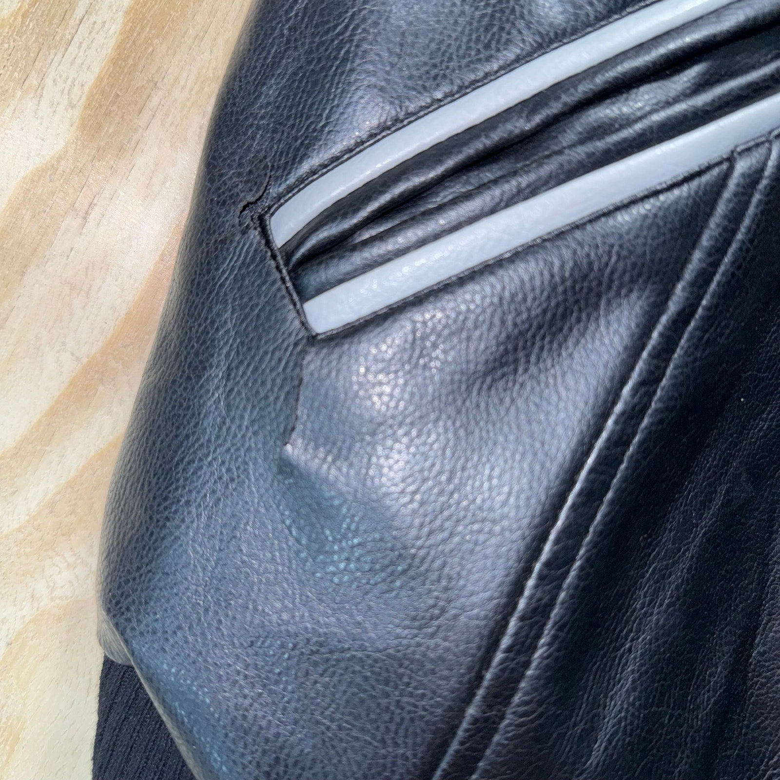 Vintage / Y2K Oakland Raiders spell out logo across chest sleeve hit back, hit crest, shield logo, essential heavyweight leather jacket sportswear football, long sleeve button up coat on NFL tag football sportswear Las Vegas Los Angeles, essential embroidery front and back hit double-sided multiple graphic
