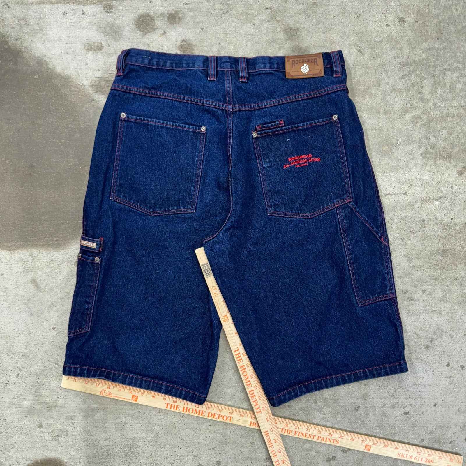 Vintage / Y2K rocawear Jay-Z Brand hip-hop 2000s era RW logo embroidered on front and rock aware all American denim industries fell out on back pocket, embroidered carpenter style workwear rivets essential