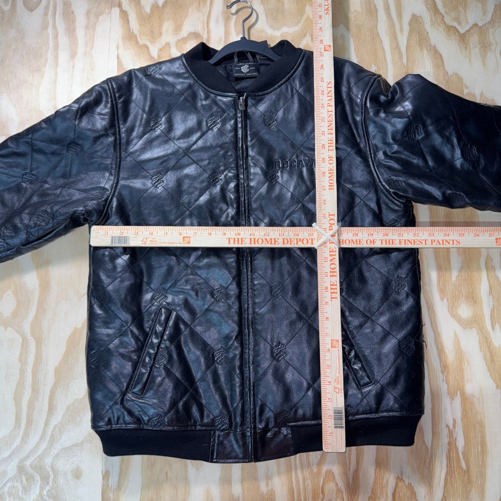 Vintage / Y2K rocawear leather zip up jacket, crazy piece monogram style RW logo front and back hit spell out double-sided multiple graphic Jay-Z brand hip-hop, New York style insane piece