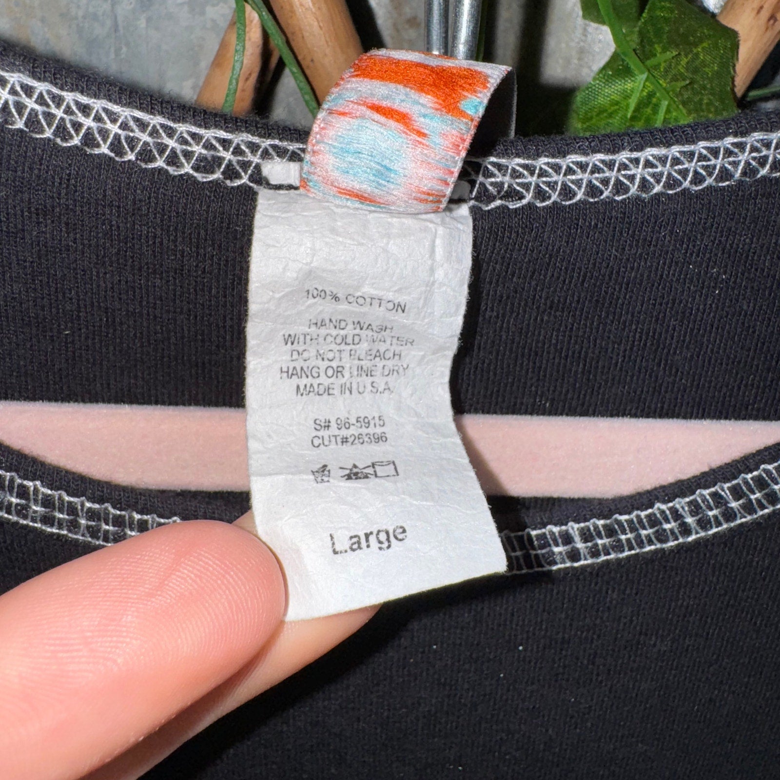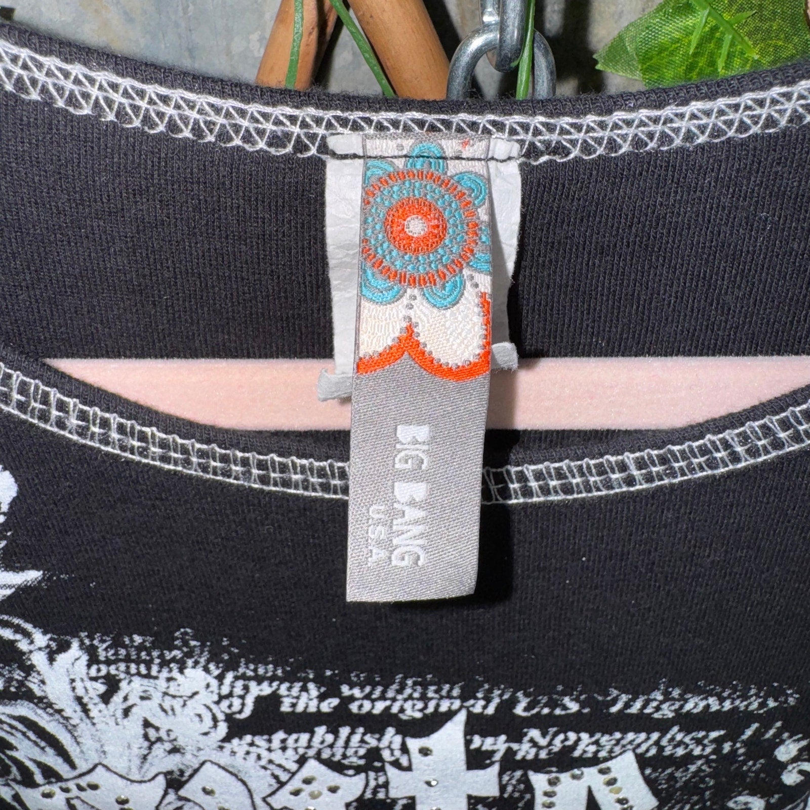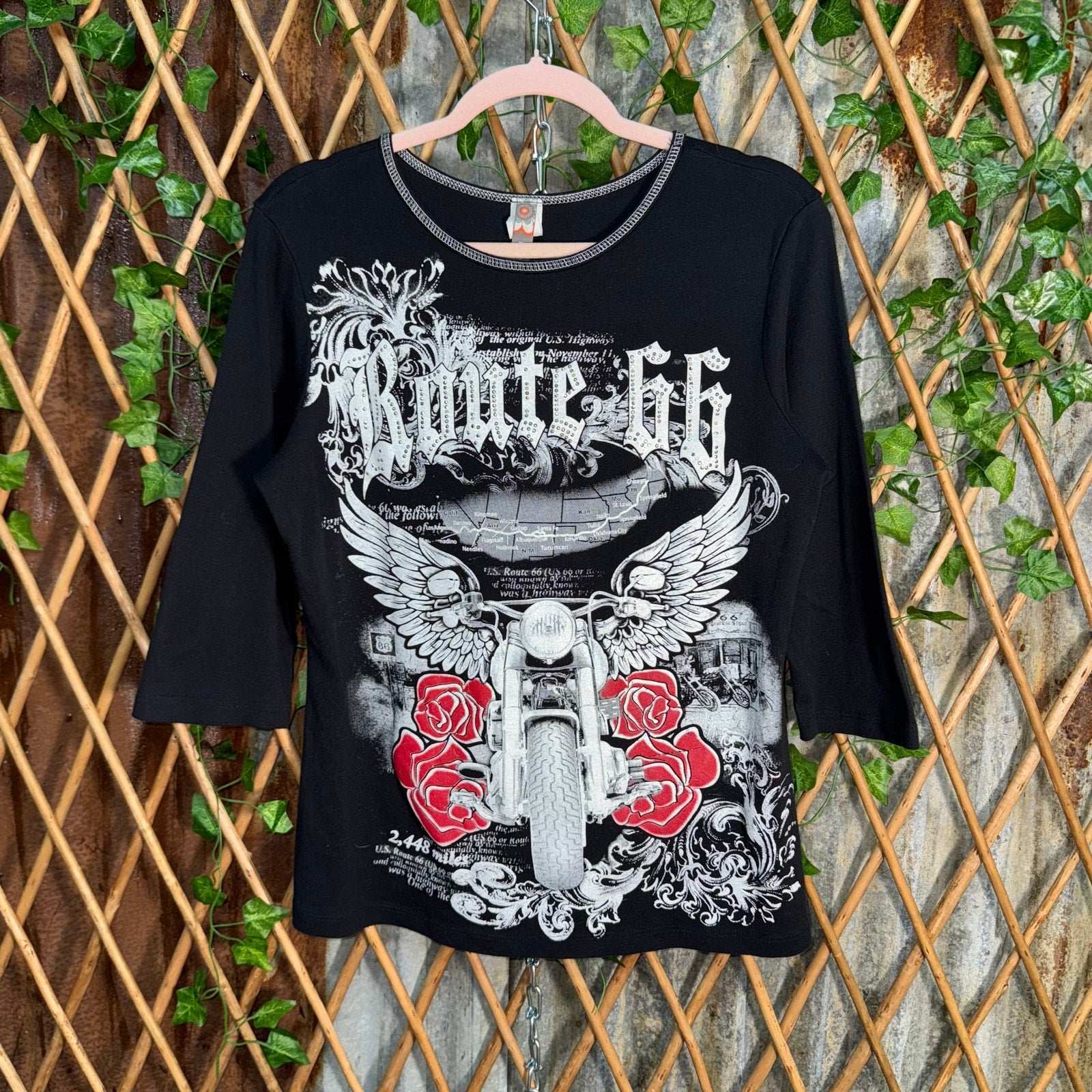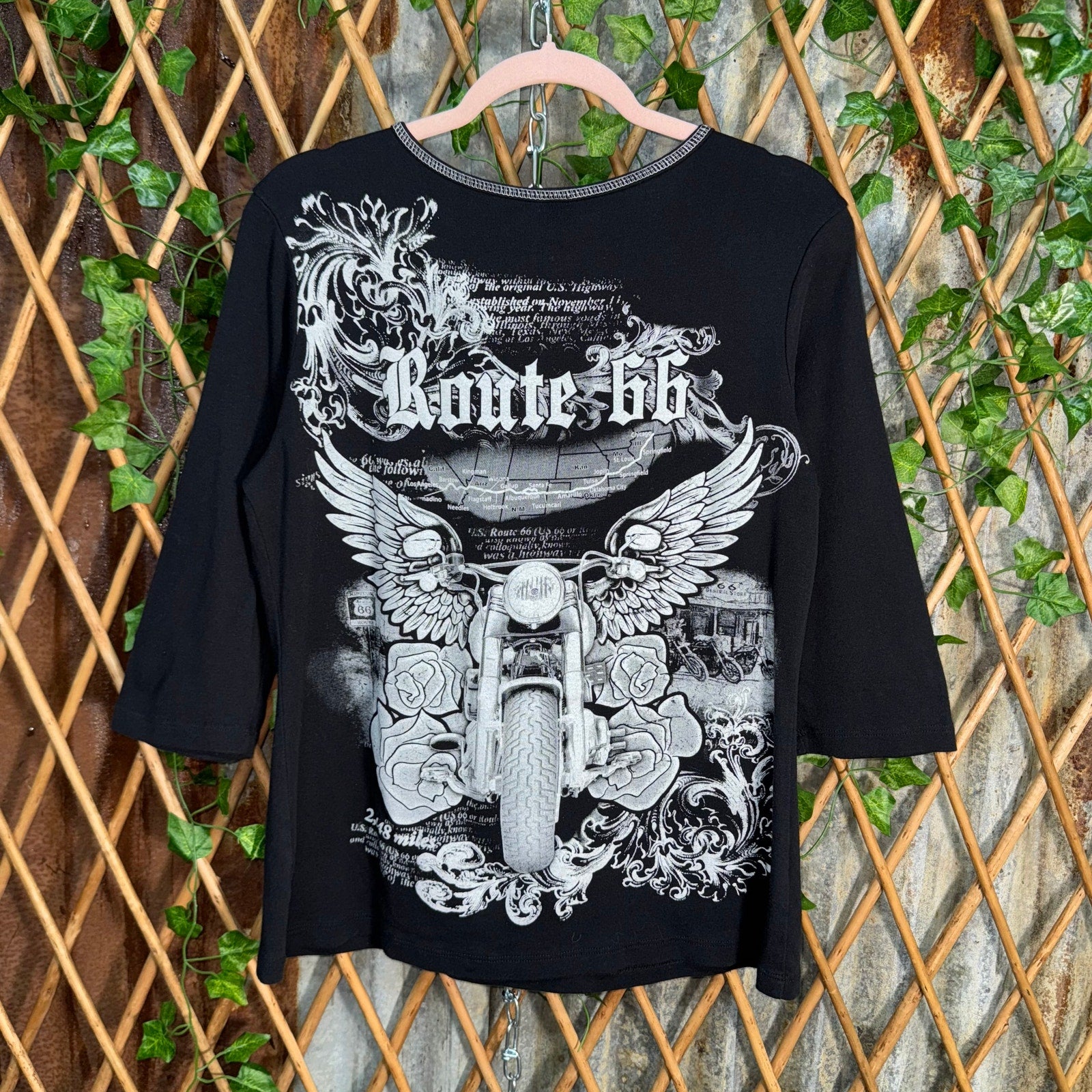 Vintage / Y2K route 66 motorcycle biker chopper 2000s era black three-quarter sleeve women’s/FEMM angel wings bling bedazzle rhinestone flower Harley Davidson style route across USA, Chicago, Springfield, St. Louis, Joplin Tulsa, Oklahoma City, Armarillo tucumcari Santa Fe, Albuquerque Winona, Flagstaff Holbrook, Kingman, Needles, Barstow, Los Angeles, San Bernardino