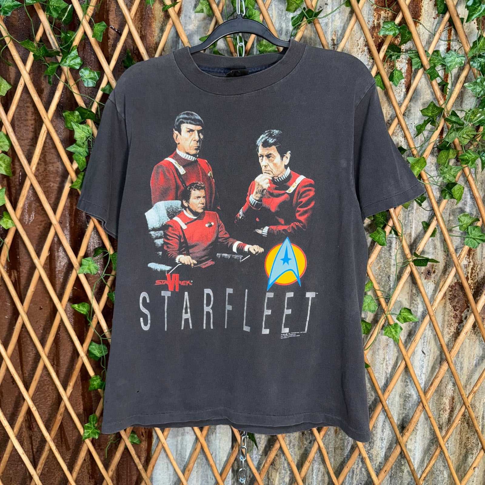 Vintage / Y2K Starfleet Star Trek six licensed 1991 to Paramount pictures on changes Tag, super sick, graphic, rare piece, single stitch, top and bottom Klingons back hair, graphic, double-sided, multiple graphic, super faded black T-shirt